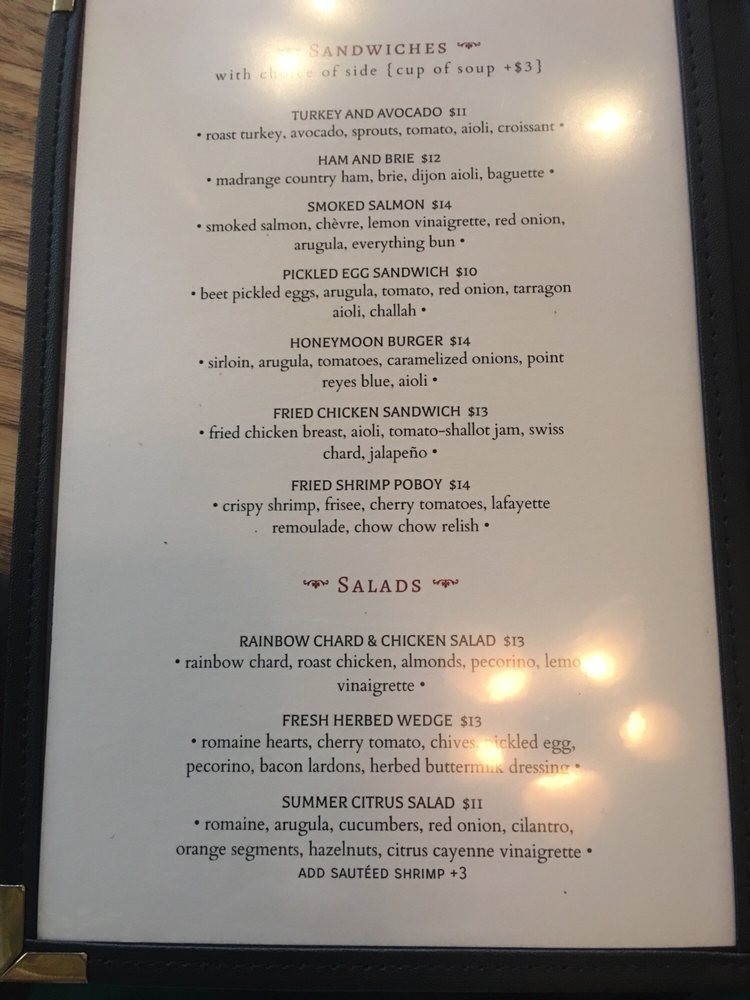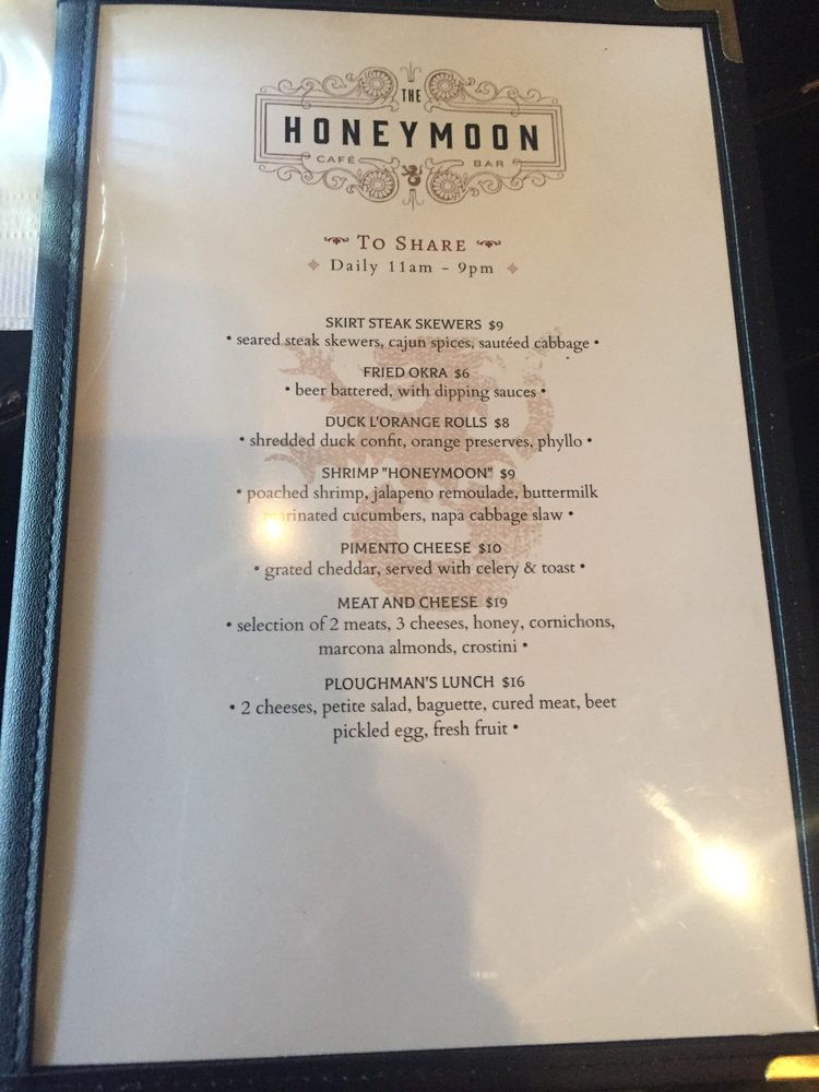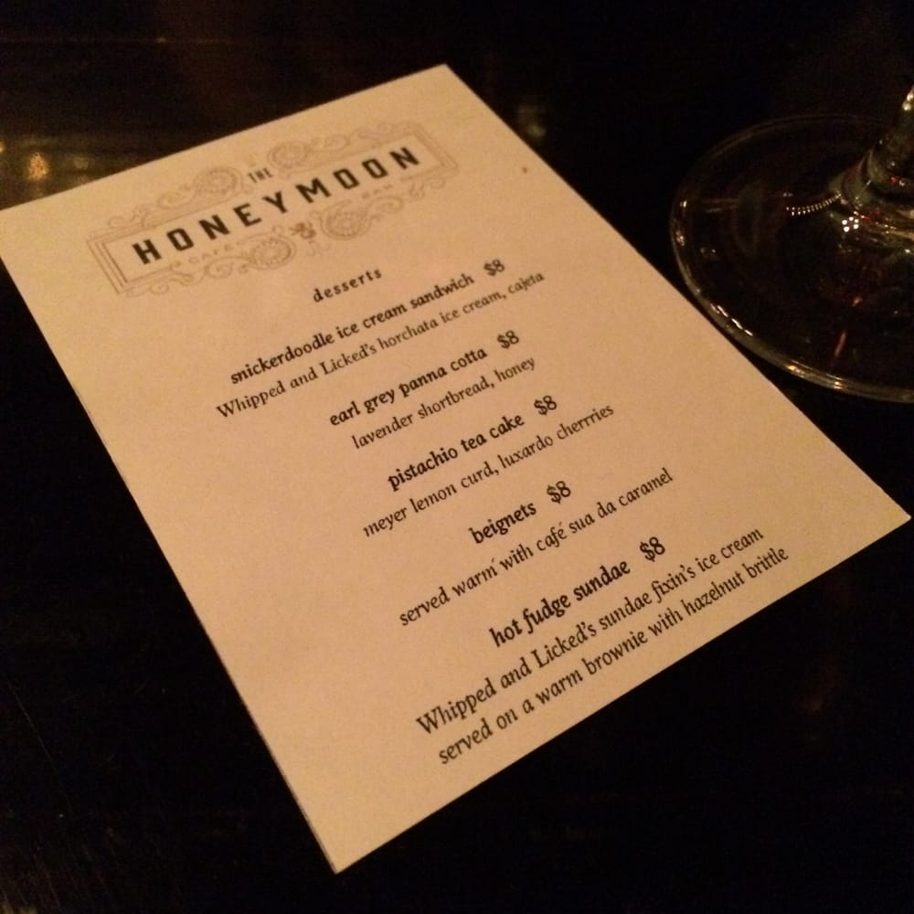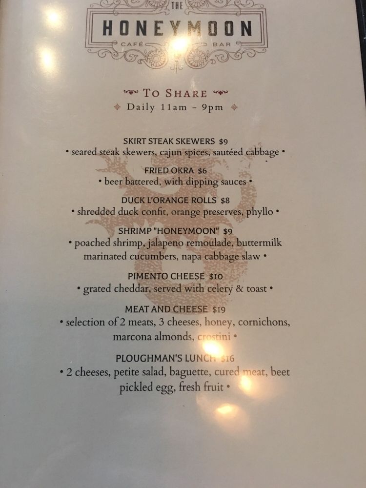 Introducing the menu at The Honeymoon Cafe & Bar, located at 300 Main St Houston, TX 77002, where hipster and casual vibes meet a full bar and outdoor seating. This cafe offers a variety of sides like Duck & Sausage Gumbo, Frites, and Red Beans & Rice. Their sandwiches range from Fried Chicken to a Ham & Brie option. Entrees include Lamb Shank Grillades and Shrimp éTouffée, showcasing the diverse flavors they offer. With amenities such as free Wi-Fi, bike parking, and waiter service, The Honeymoon Cafe & Bar is a great spot for breakfast, brunch, or even a night out with friends. Don't miss out on the unique dishes and vibrant atmosphere this cafe has to offer.